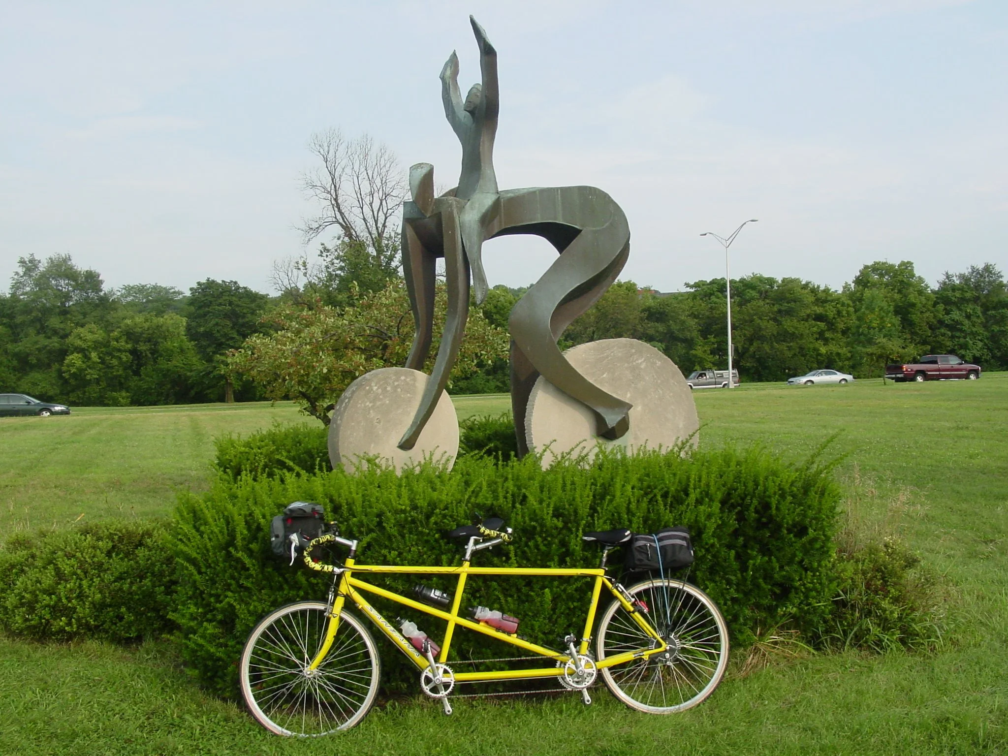 Kim and I went on a Tandem Rally in Dayton Ohio in 2003. This picture is of our 98 Santana Arriva leaning agains the bushes by the cycling statue at Dayton University..